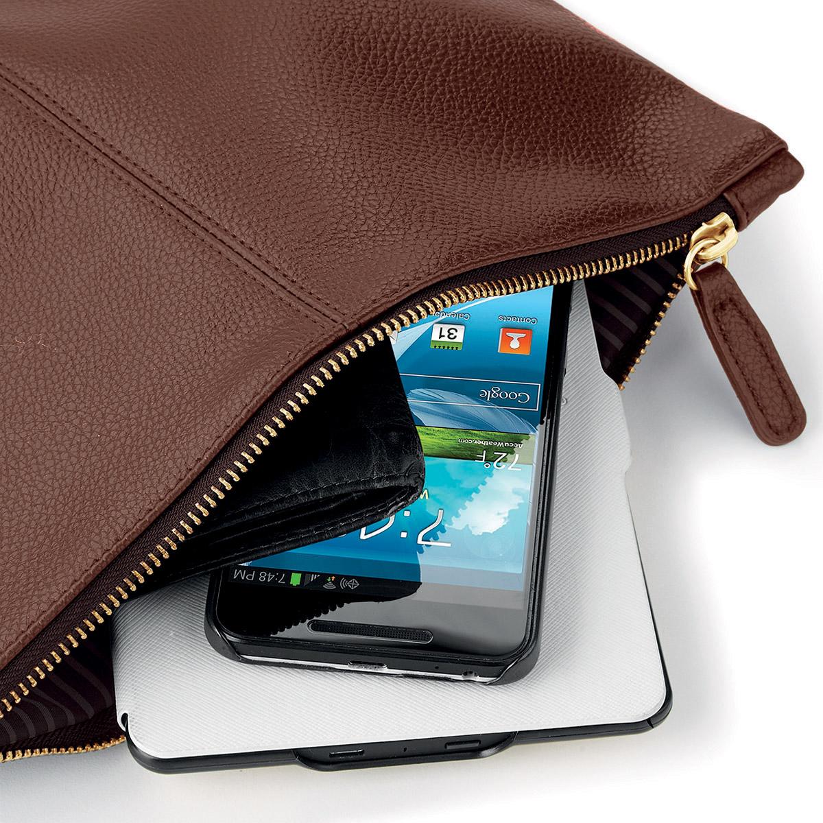 100% poliuretano NuHide. Astuccio con interno tessuto gessato, perfetto per iPad mini e tablet, comparto principale regolabile con zip. Dimensioni: 28 x 20 cm, capacita': 2 litri